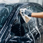 Carwash service, car cleaning, front view. Auto detailing, worker soaps glasses